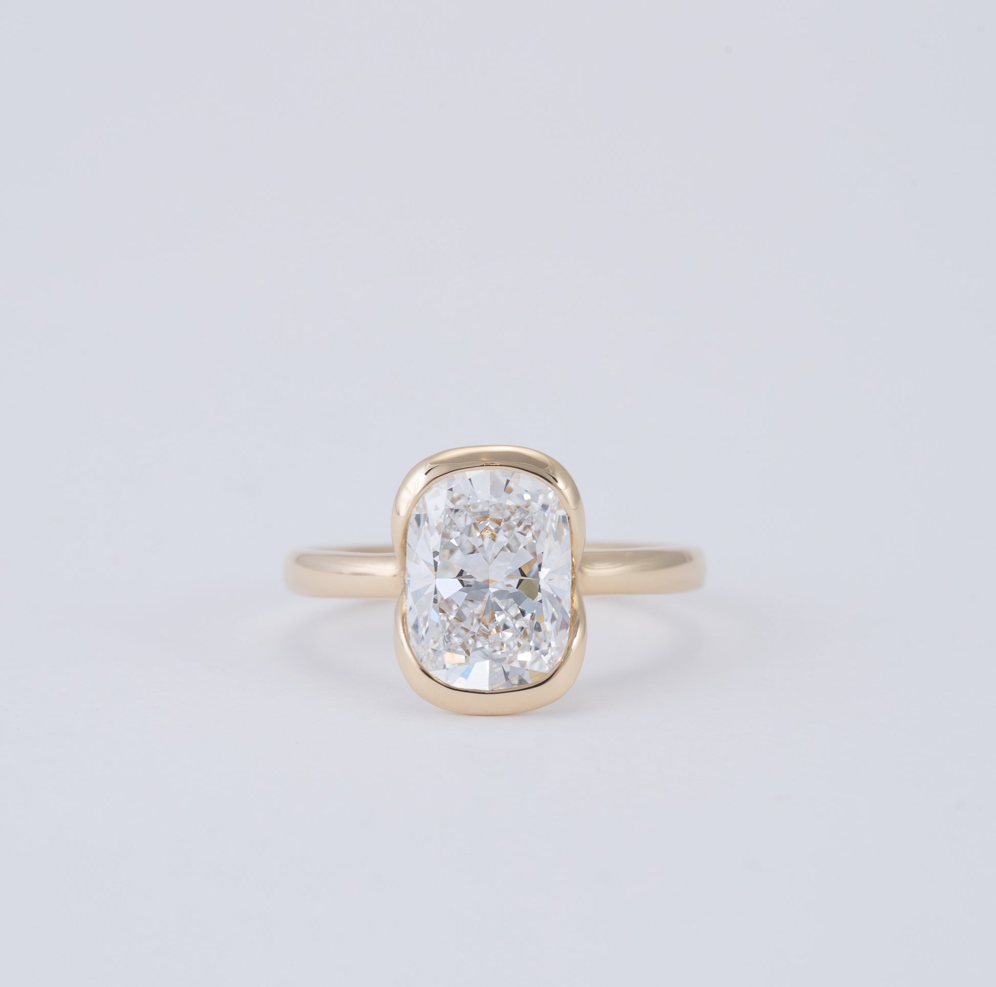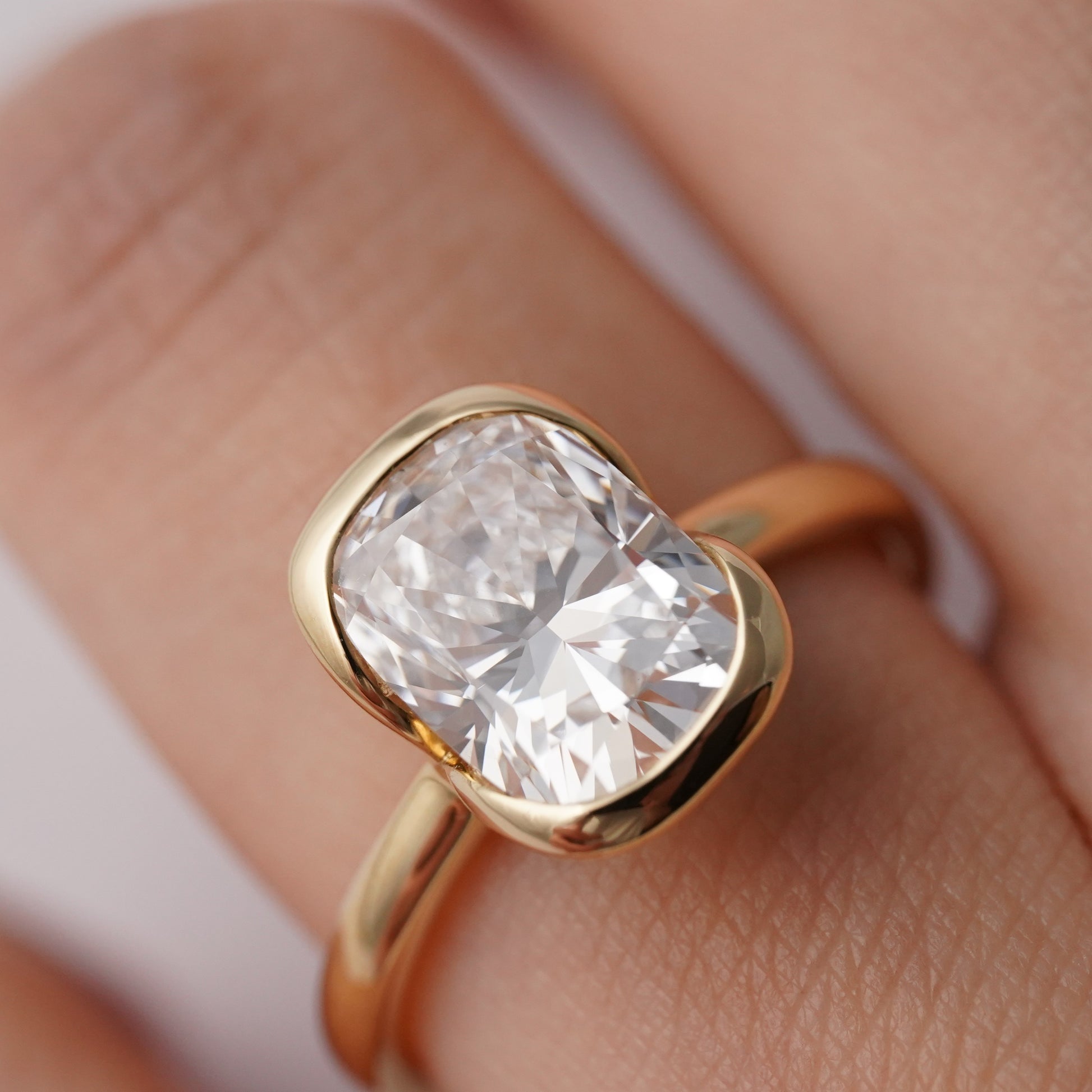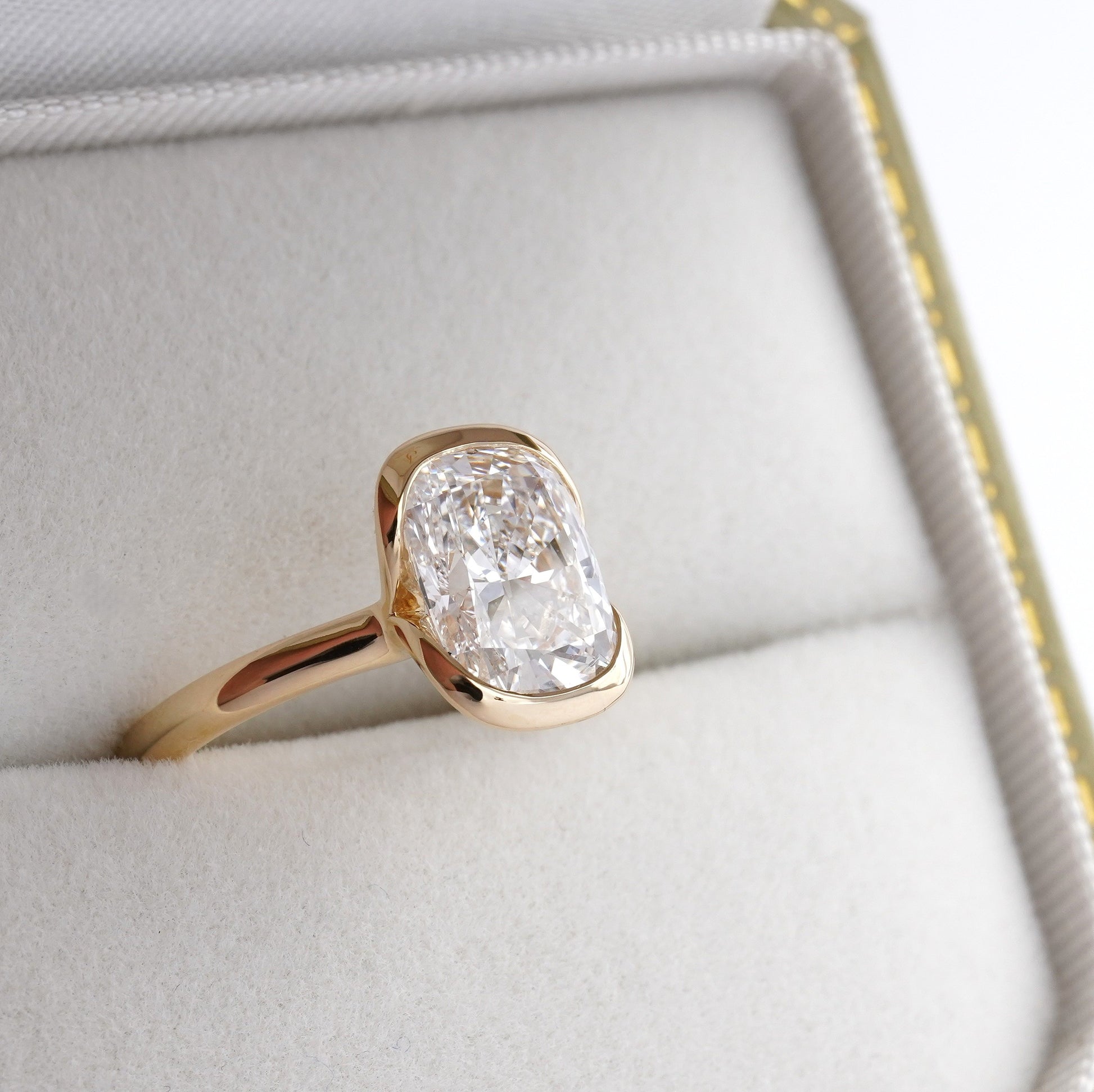 Bijou - Cushion is our signature modern chic half bezel engagement. Combined with a Elongated Cushion Cut centre stone this ring provides a softer and chunkier bezel compared to its Radiant counterpart.